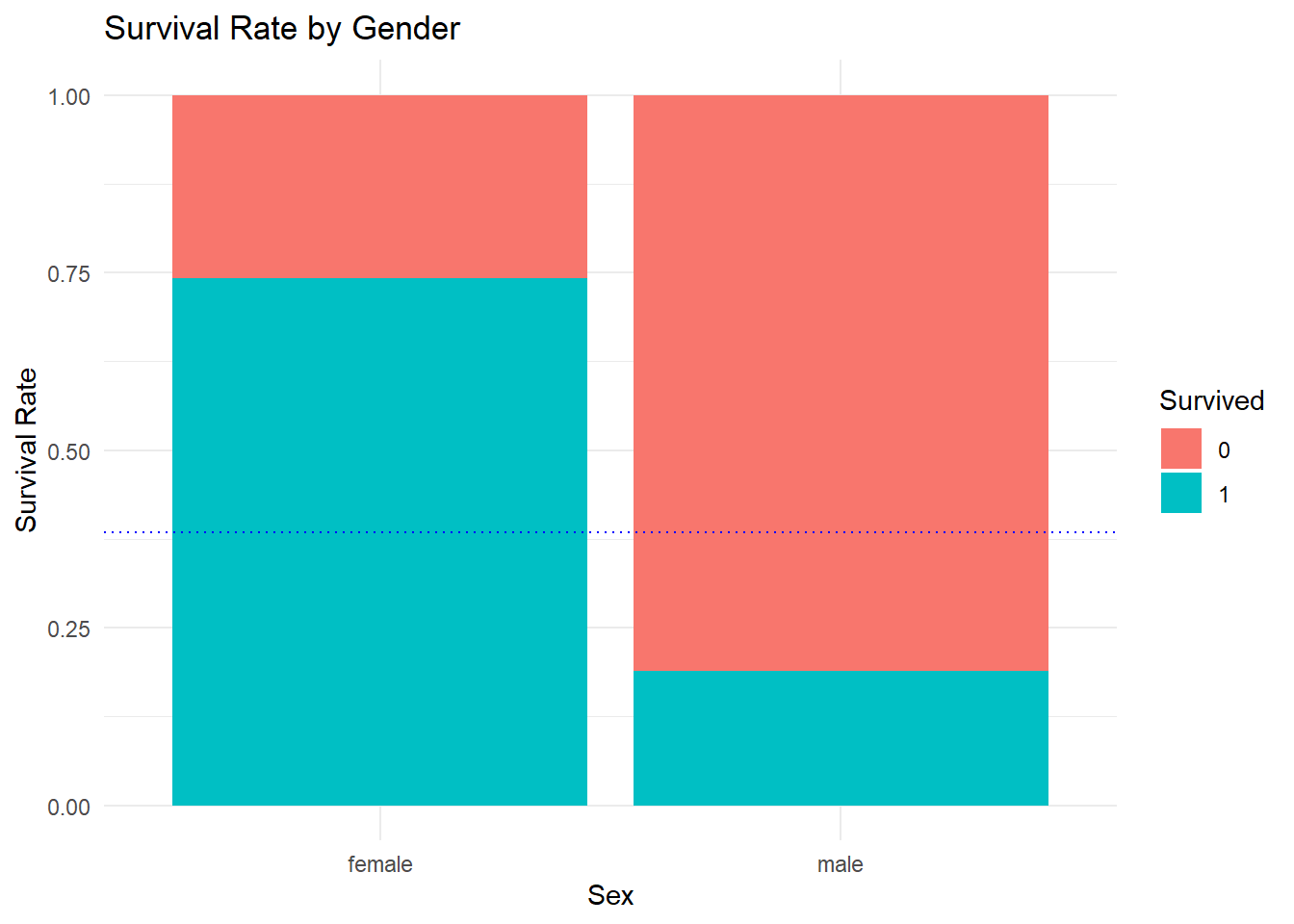 It should be clear that being in first class was beneficial to survival. Note that in the plot the abbreviation lty = 2 was used instead of linetype = "dotted" this time.