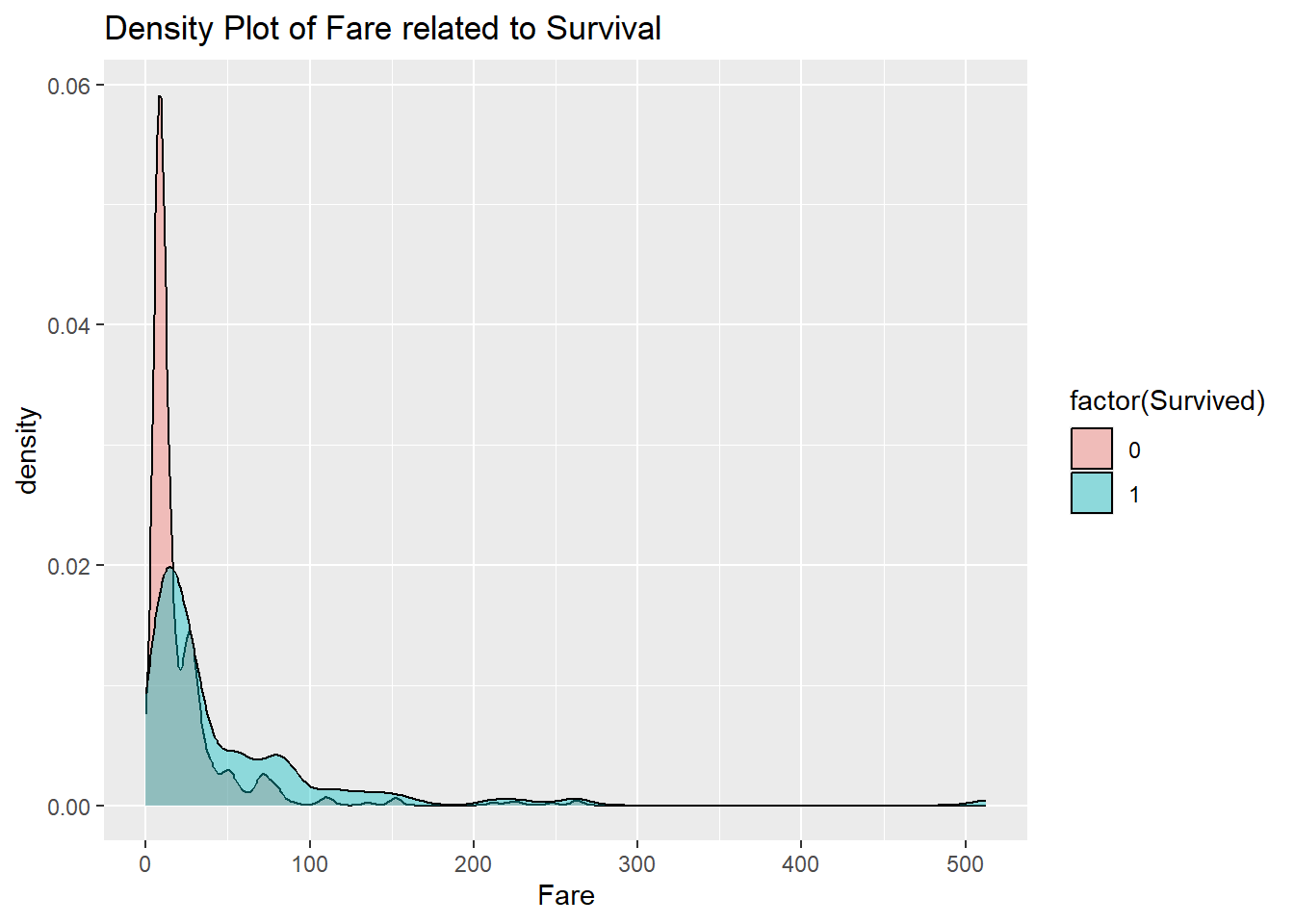 ggtitle("Density Plot of Fare related to Survival")## Warning: Removed 15 rows containing non-finite outside the scale