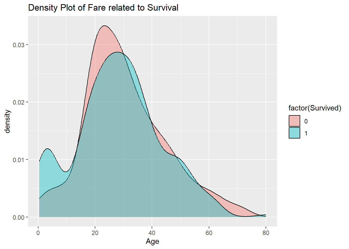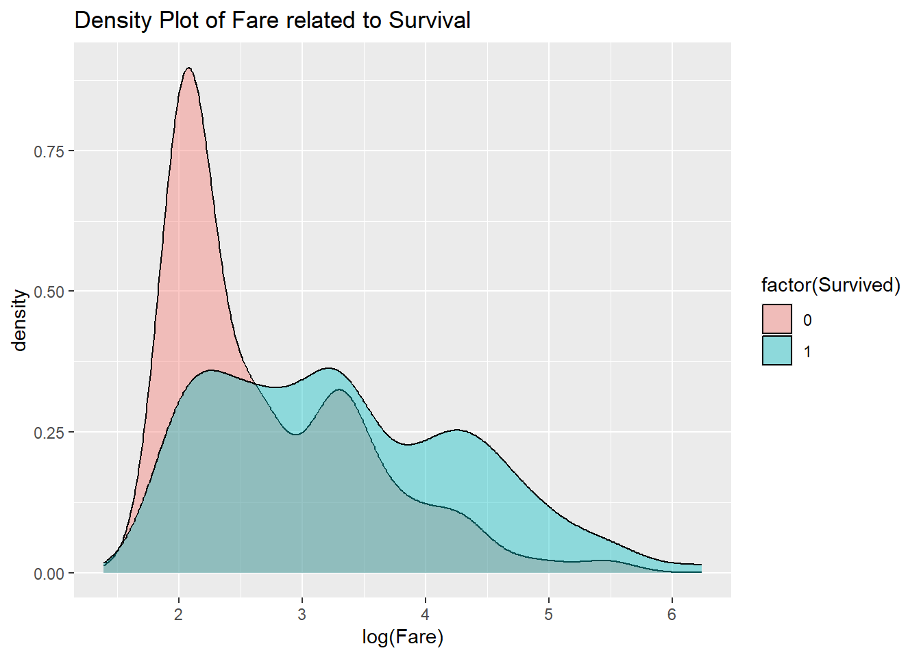 ggtitle("Density Plot of Fare related to Survival")## Warning: Removed 177 rows containing non-finite outside the scale