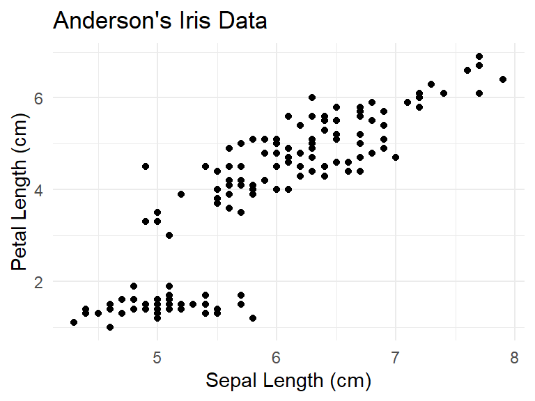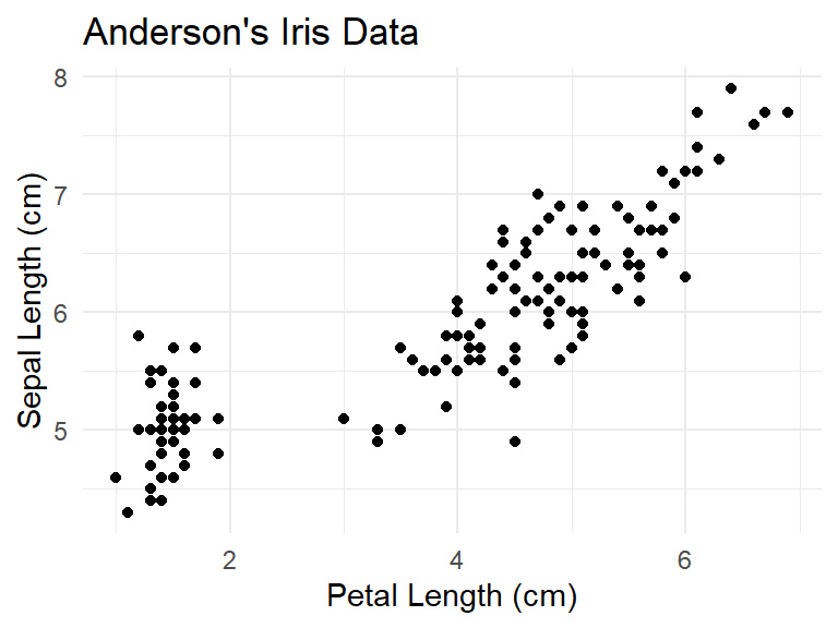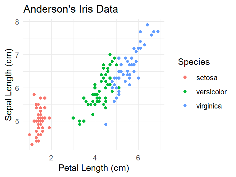 Consider a built data set to R called iris. This dataset measures the sepal and petal length (in cm) of three species of iris found in Canada and Alaska.