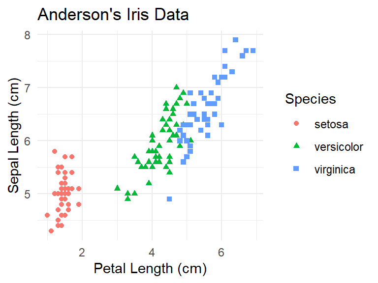Seeing the colors makes the three clusters of species points clear. Unfortunately, not everyone can see different colors. The shape of the point can also be adjusted.