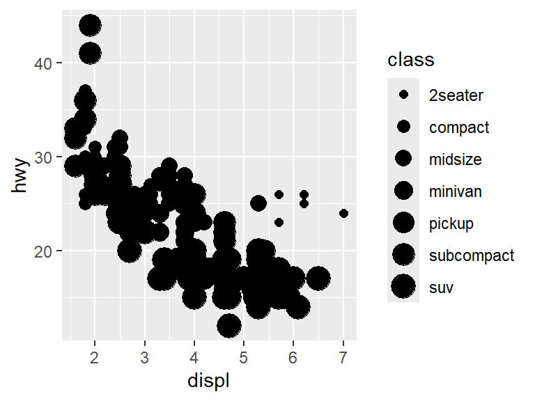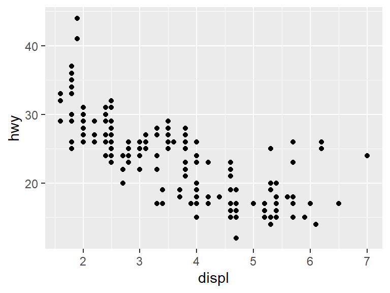 ggplot(data = mpg, mapping = aes(x = displ, y = hwy)) +