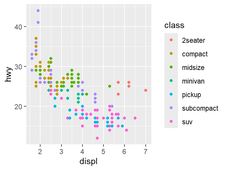 However, there is a weird exception among the points. Most of the data clumps together in the same spot, but there are some data points near the right hand side that seem higher than the main body of points. Perhaps those points represent a special type of car? To add that dimension of the data to the graph, We will use color to show the class of the car.