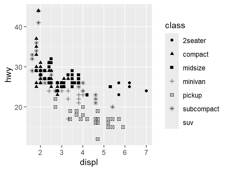 This provokes another warning. In this case the data has seven classes, but there are only six shapes so the SUV class does not get a shape.