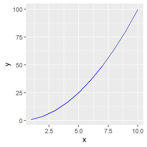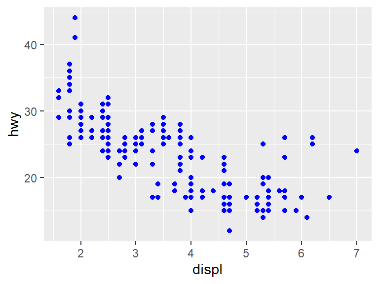 Note that the color parameter is outside of the aes. If the color should depend on the data, it needs to go inside the aes. But since this common just colors all data points blue, it becomes part of a parameter color directly for geom_point, and not for aes.