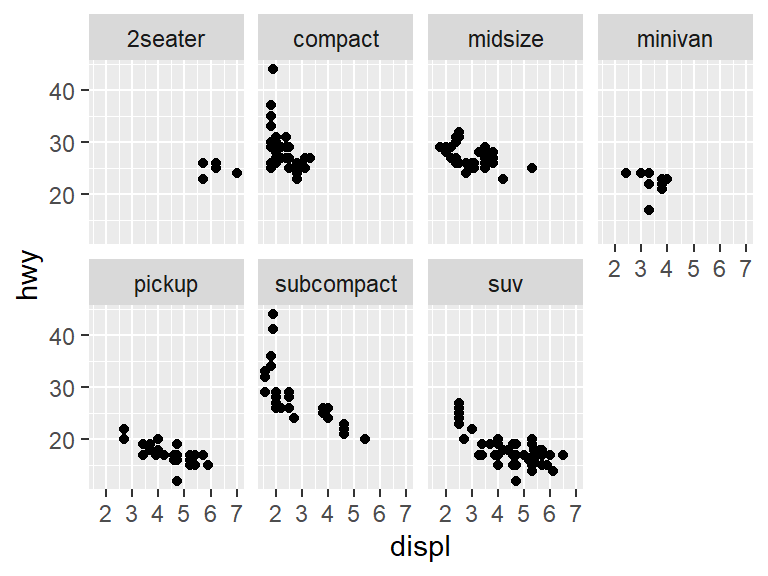 For instance, the facet_wrap function can break data into groups based on a predictor variable. In statistics, the notation ~ predictor_variable tells us that the variable to the right of the ~ sign is being used to predict something. In the case of a graph, this will split the graph into a different graph for each value of the predictor. To split on the variable class, use: