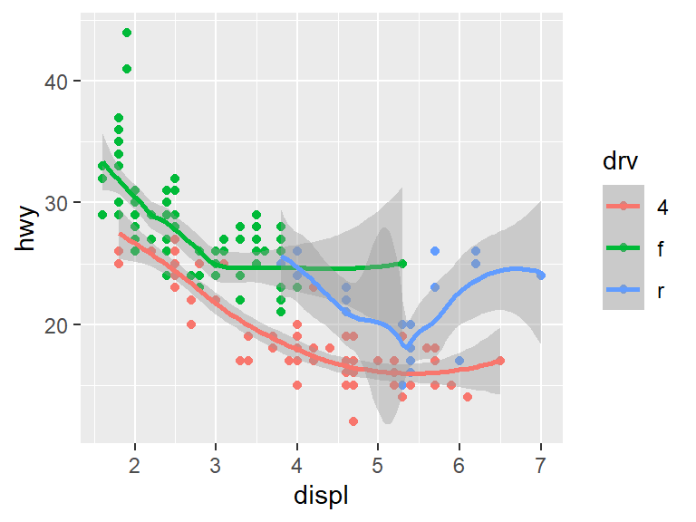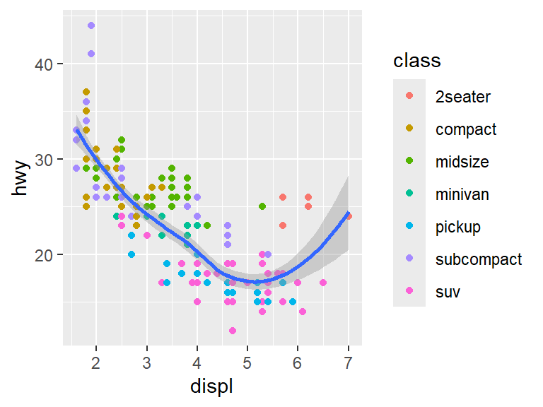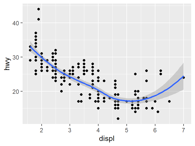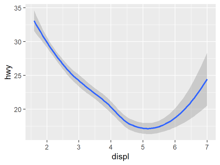 geom_smooth(mapping = aes(x = displ, y = hwy))## `geom_smooth()` using method = 'loess' and formula = 'y ~