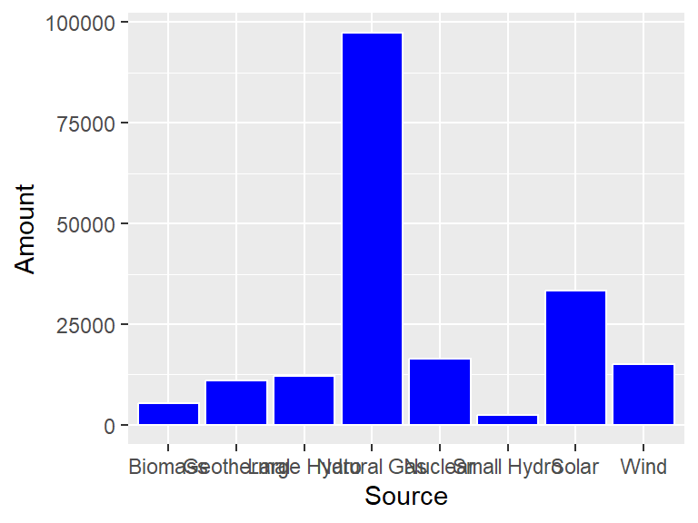 )To visualize this with a bar graph, the geom_bar can be used. The height of each bar will be the Amount value, and there will be a bar for each Source.