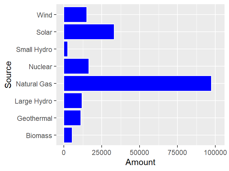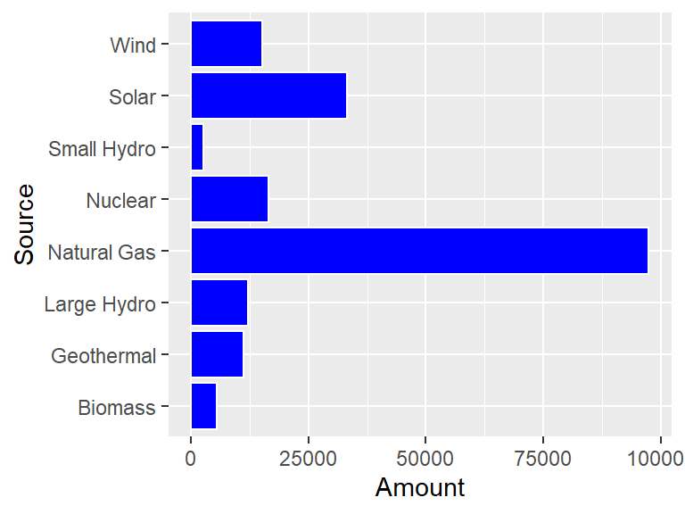 Consider the following data set, which holds the different sources of energy that were above 1000 GWh used in California in 2019.