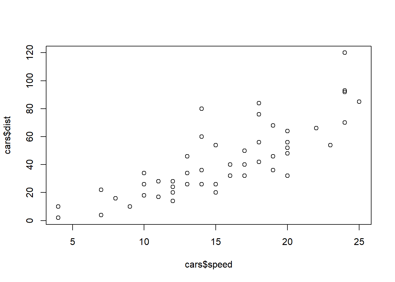 This simplest thing we can do is just make a plot of the distance values versus the speed values. The plot and $ operators can do just that. (Later on, a more systematic way of constructing plots will be presented. For now, though, the basic built in commands to R will suffice.)