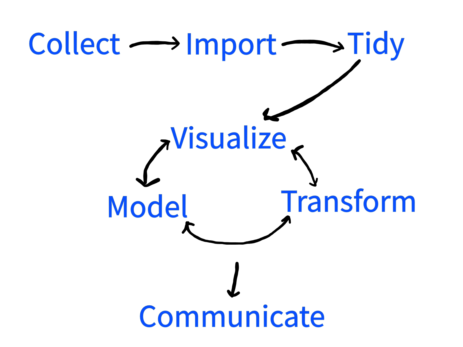 These three activities are not done in isolation, but build off of each other. An early visualization might make a researcher realize that their data lies in a subspace of the available variables. By transforming the data by projecting onto that subspace, a new visualization might see further patterns that were hidden in the original data. A specific model might lead to a better visualization, which gives the user a transformation of the data that needs a new model. And so it goes, one technique feeding into the other until the complexities of the data is understood.