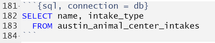 The above code chunk executes SQL code. So far, all our code chunks have had {r} at the beginning in order to indicate that R code is being used. However, this code chunk has {sql, connection = db} at the beginning to indicate that SQL code accessed through the database connection assigned to db is being used. Here is a picture of the code chunk as it appears within R Markdown.