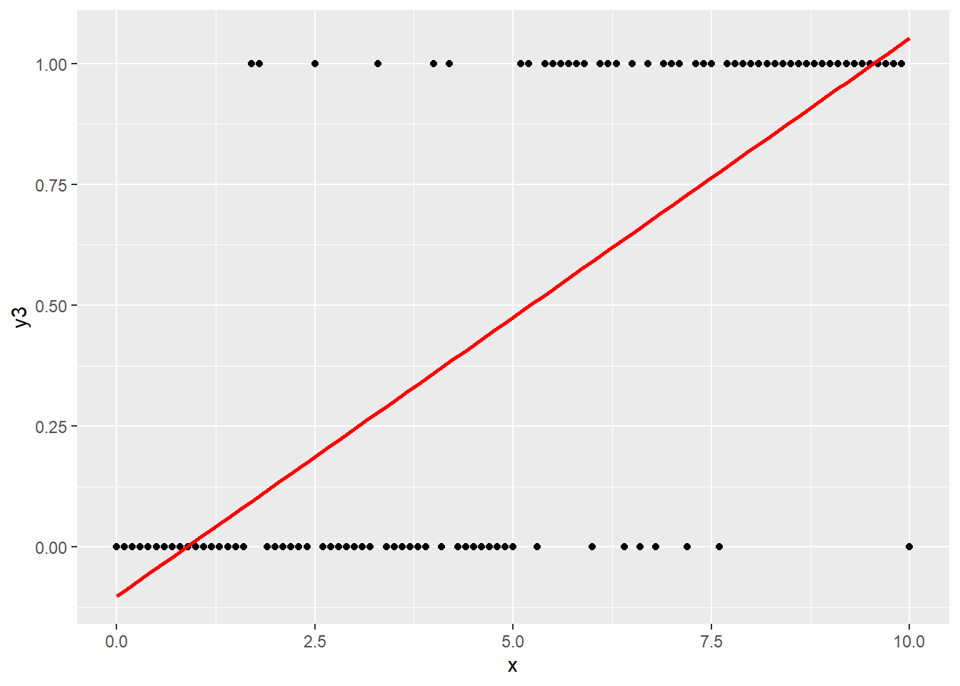 A bit hard to see from the first few points what the prediction looks like. Graphing this is a bit tricky, the y3 values should be used so that R treats it as a number rather than as a factor. The y-axis labels should just be 0 and 1. The scale_y_continuous can ensure that this happens.