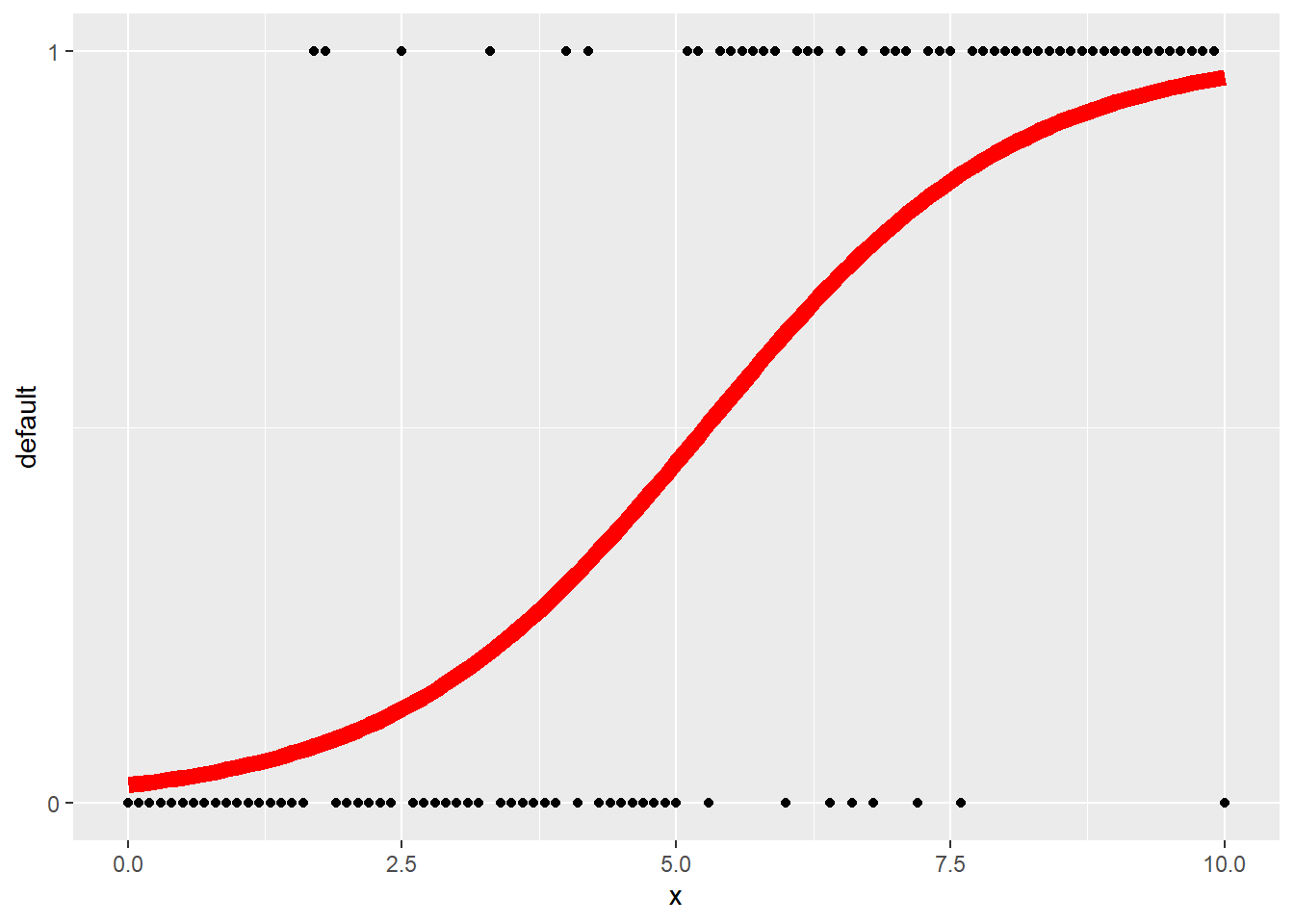 A simple prediction method is then: if \(p \geq 0.5\) predict 1, otherwise predict 0. Note that this is very close to what the decision tree would do for this data set. For this random data, it makes the cutoff greater than 5, without more data it will be unable to pinpoint the change point.