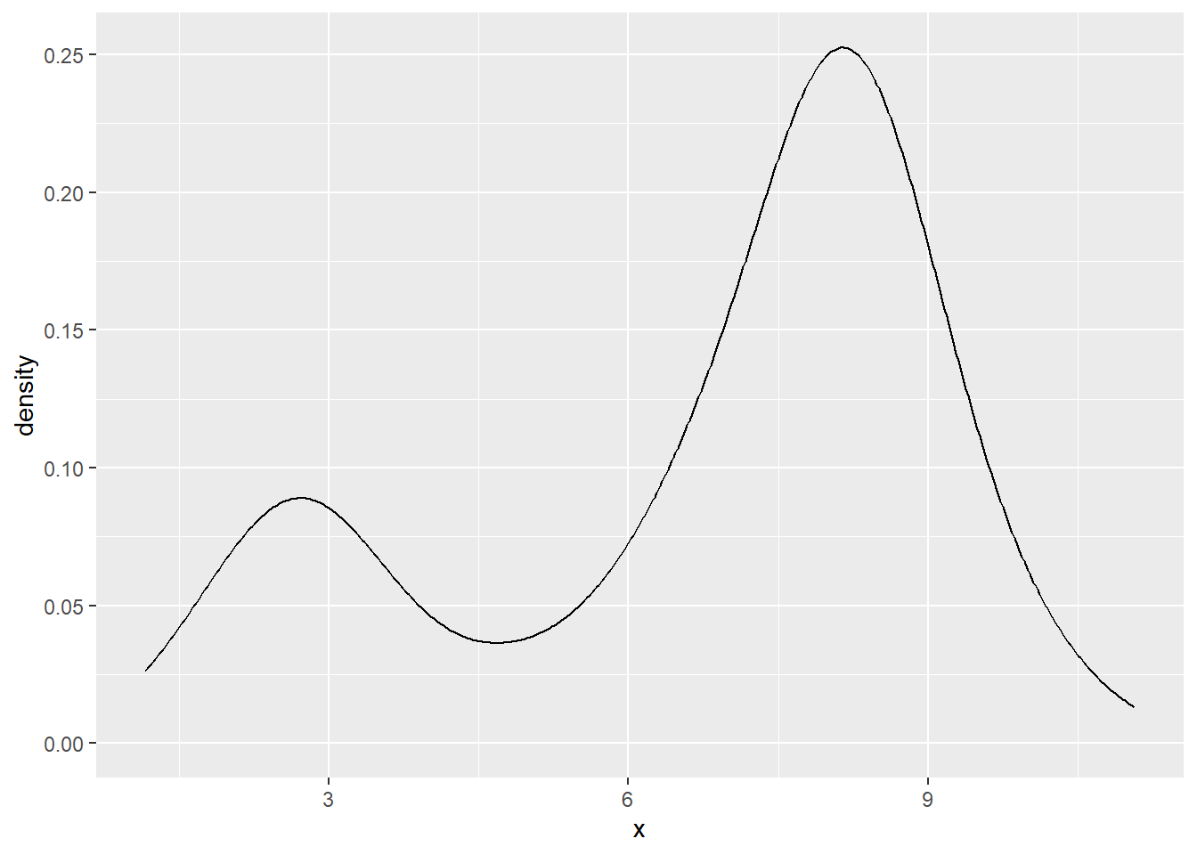 Another type of clustering is based upon kernel density estimation. Here a normal density is placed on top of each point in the data set and then added up. For instance, suppose we have some \(x\) values drawn using a normal distribution centered at 3, and others drawn using a normal distribution centered at 8. This gives bimodal data. Then the kernel density plot might look as follows.