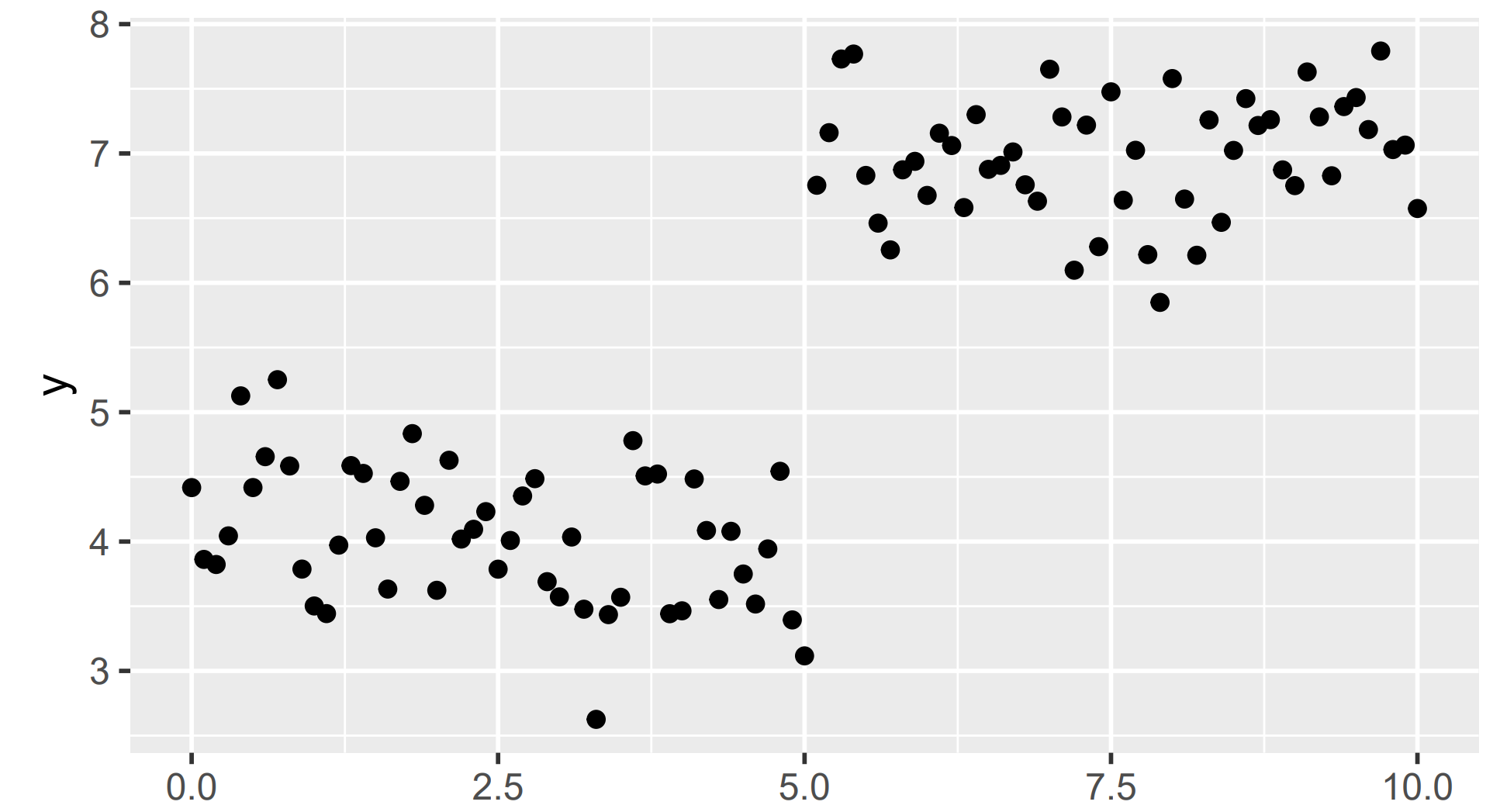 In the data above, there is a clear break in the \(y\) values for \(x < 5\) and \(x \geq 5\). On either side of this split, the \(y\) values are much closer to one another.