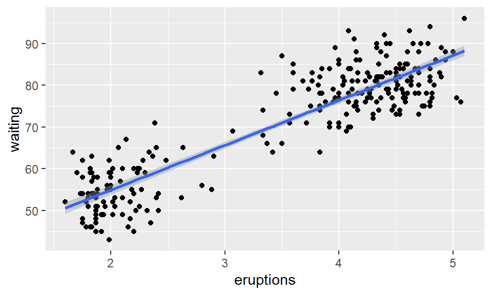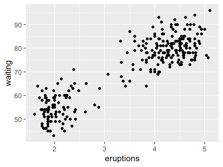 ggplot(data = faithful, aes(x = eruptions, y = waiting)) +