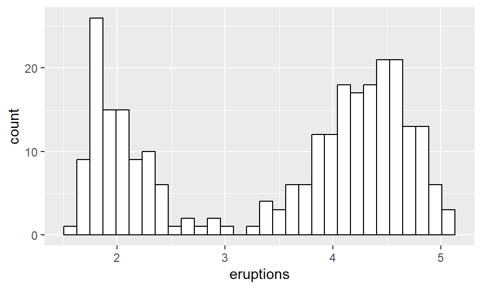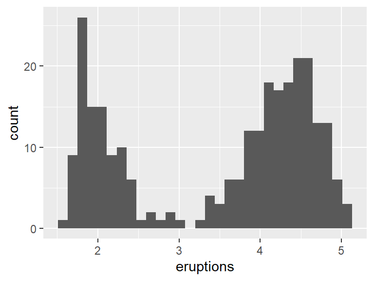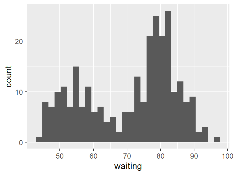 To see if the eruptions times are evenly spread, a histogram can be used. A histogram takes numerical data and divides it into bins. The number of observations that fit in each bin are then plotted as a bar chart. This can be done with geom_histogram.