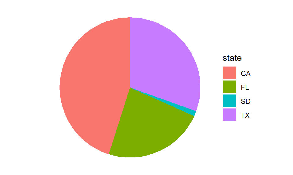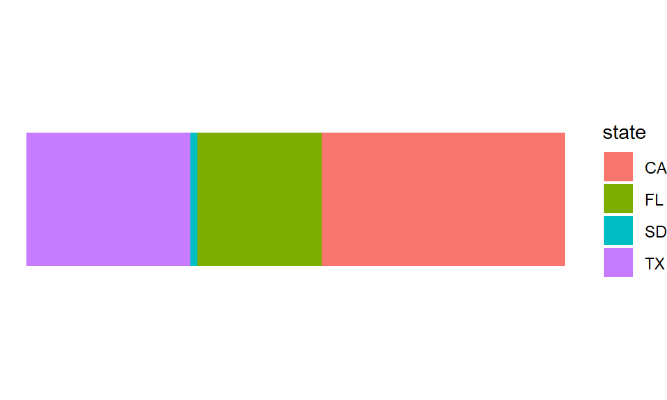 When you have values that comprise a population, a composition plot is a good way to visualize the data. For instance, the population of the states of California, Texas, Florida, and South Dakota are 37, 25, 19, and 1 million (rounded to the nearest million). First place this into a tibble using the tibble function. To use this function, we first load the tibble package.