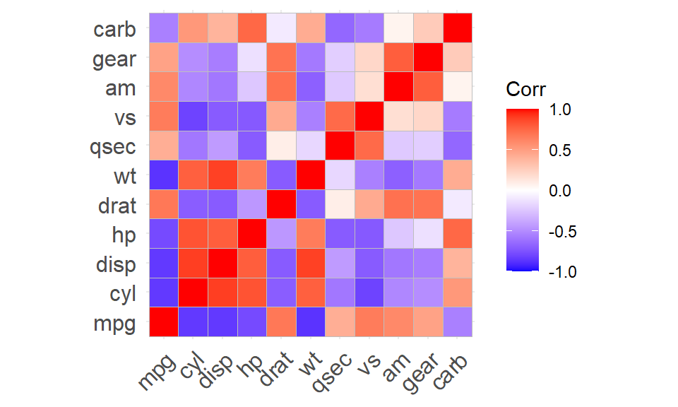 Even rounded, the matrix of correlations is difficult to understand. A correlogram is a good way to turn those numbers into colors. The package ggcorrplot is helpful here. As always, first load the library (using install.packages("ggcorrplot") if not already installed) using