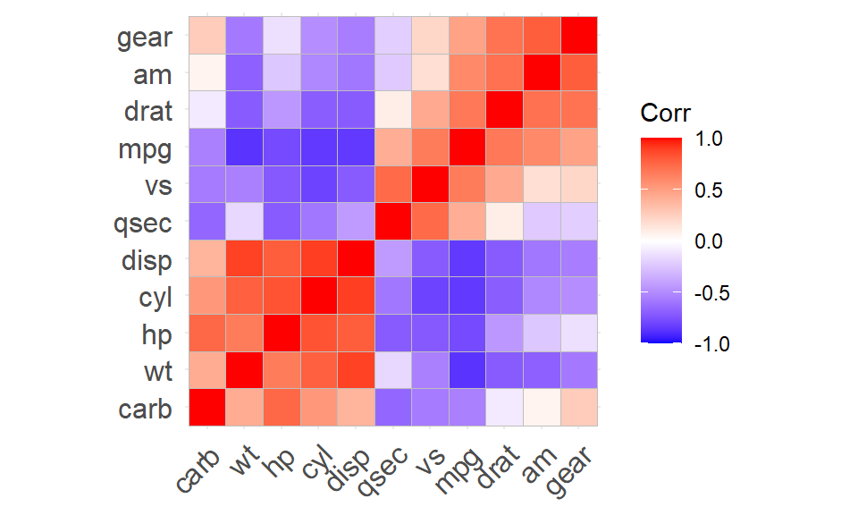 Notice that (for historical reasons), the order of the rows was reversed from when corr was used to get a matrix. This helps us pick out squares of high and low correlation, but is not much help when it comes to finding the variables that are highly positively (or negatively) correlated with each other. To see those relationships, we can reorder the rows and columns by setting the parameter hc.order to TRUE.