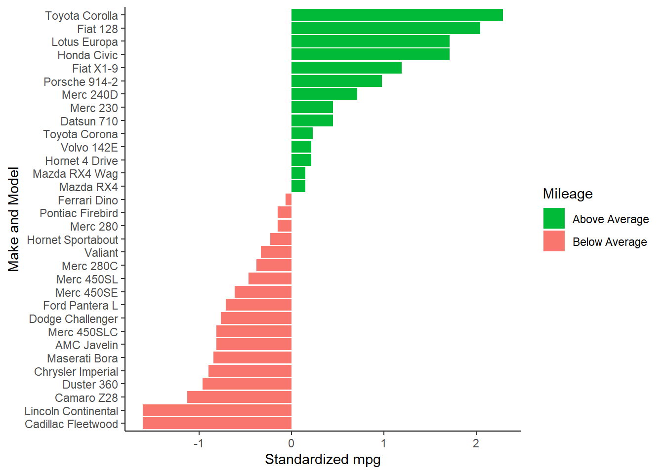 Often we wish to use bar graphs to show both positive and negative values. For instance, perhaps we are measuring how much above (or below) average the highway millage is. These are often referred to as diverging bars plots.
