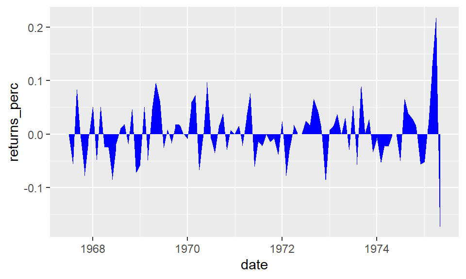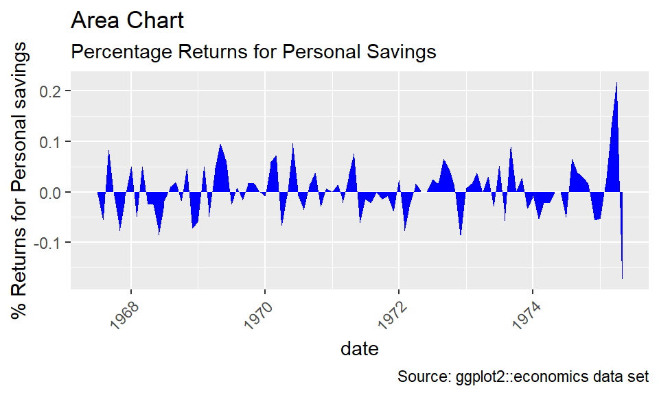 For financial data, area charts are a useful way to view values changing in time. Consider the data set economics, which includes data about the US from 1967 up to 2015. This data set is part of the ggplot2 package. The psavert variable gives the personal savings rate. Suppose that we are not interested in the savings rate itself, but in how the rate has changed over time. The diff command can find differences in a time series. For instance,