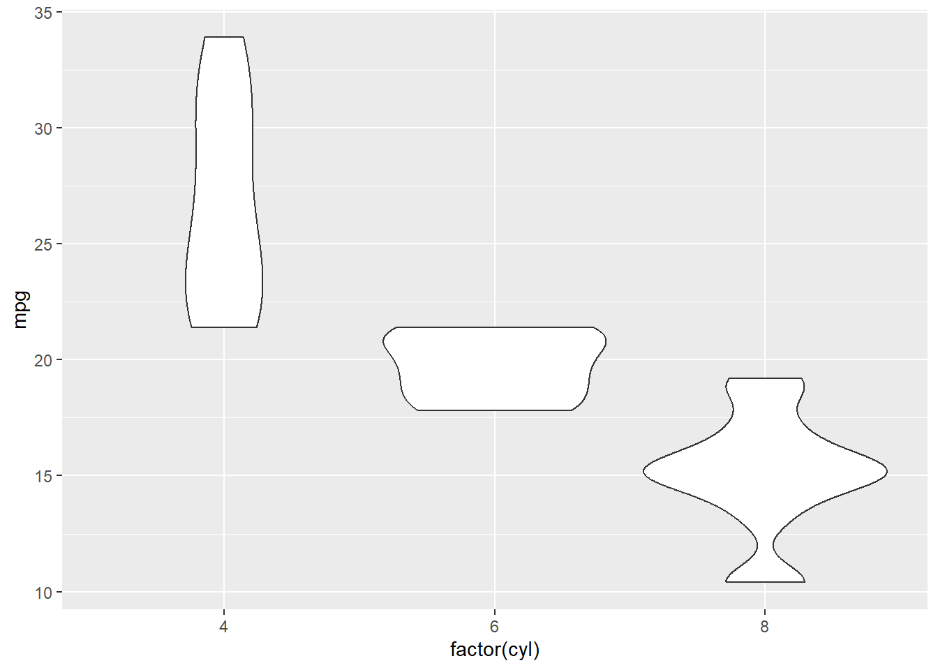 A violin plot is a method of displaying variation in a continuous variable that combines aspects of a boxplot and a histogram. Consider the following plot of data from the mtcars dataset.
