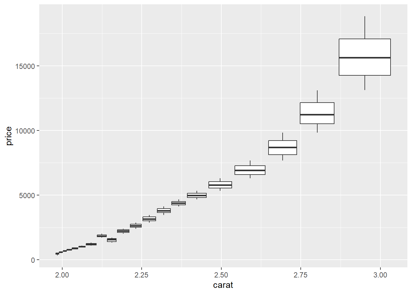 The cut_number helper function takes a continuous variable, and divides it into bins so that it can be treated as a categorical variable. For instance, in the diamonds dataset from the ggplot2 package, the carat variable can be split into 20 groups observations, and the prices of those carats presented as a boxplot with:
